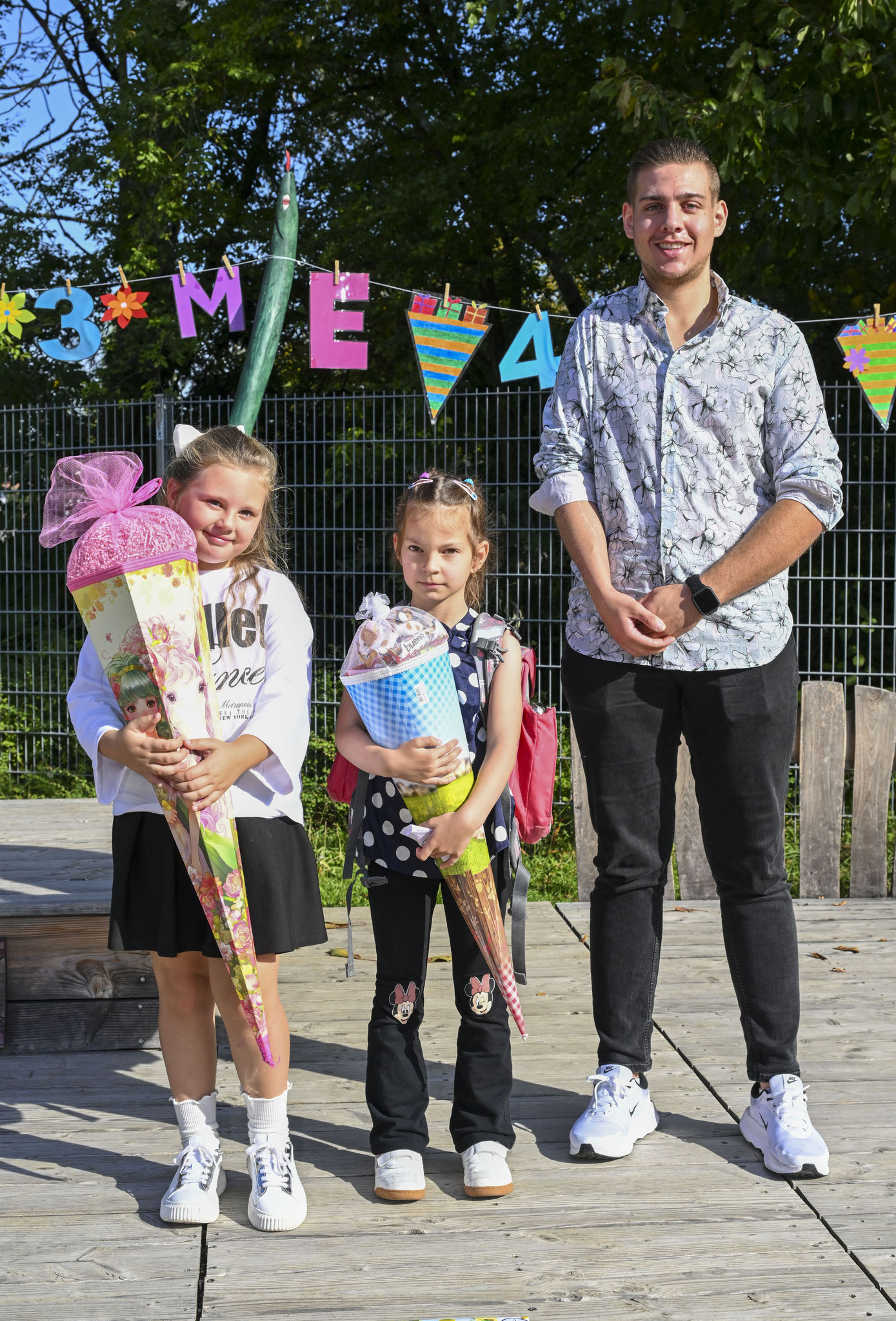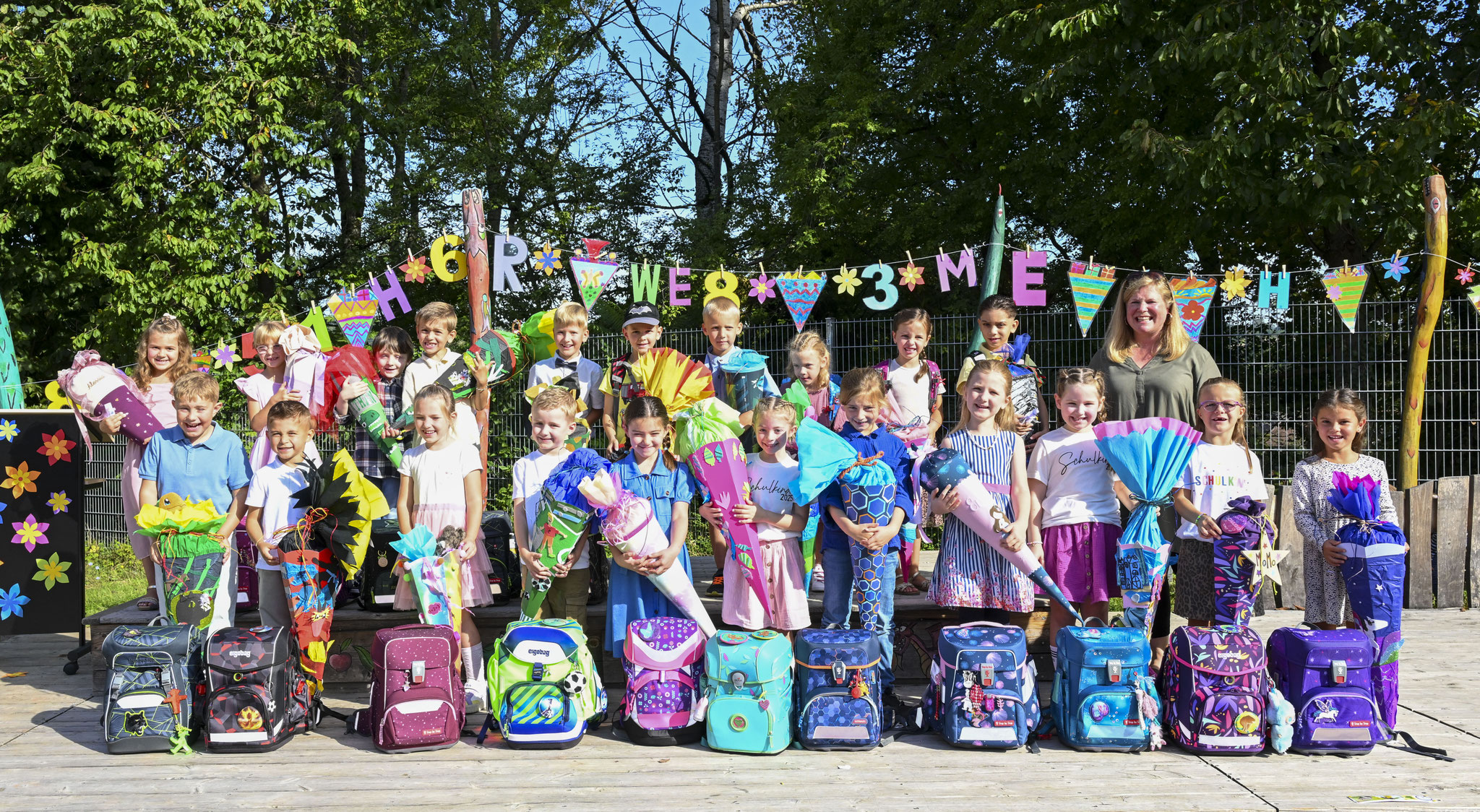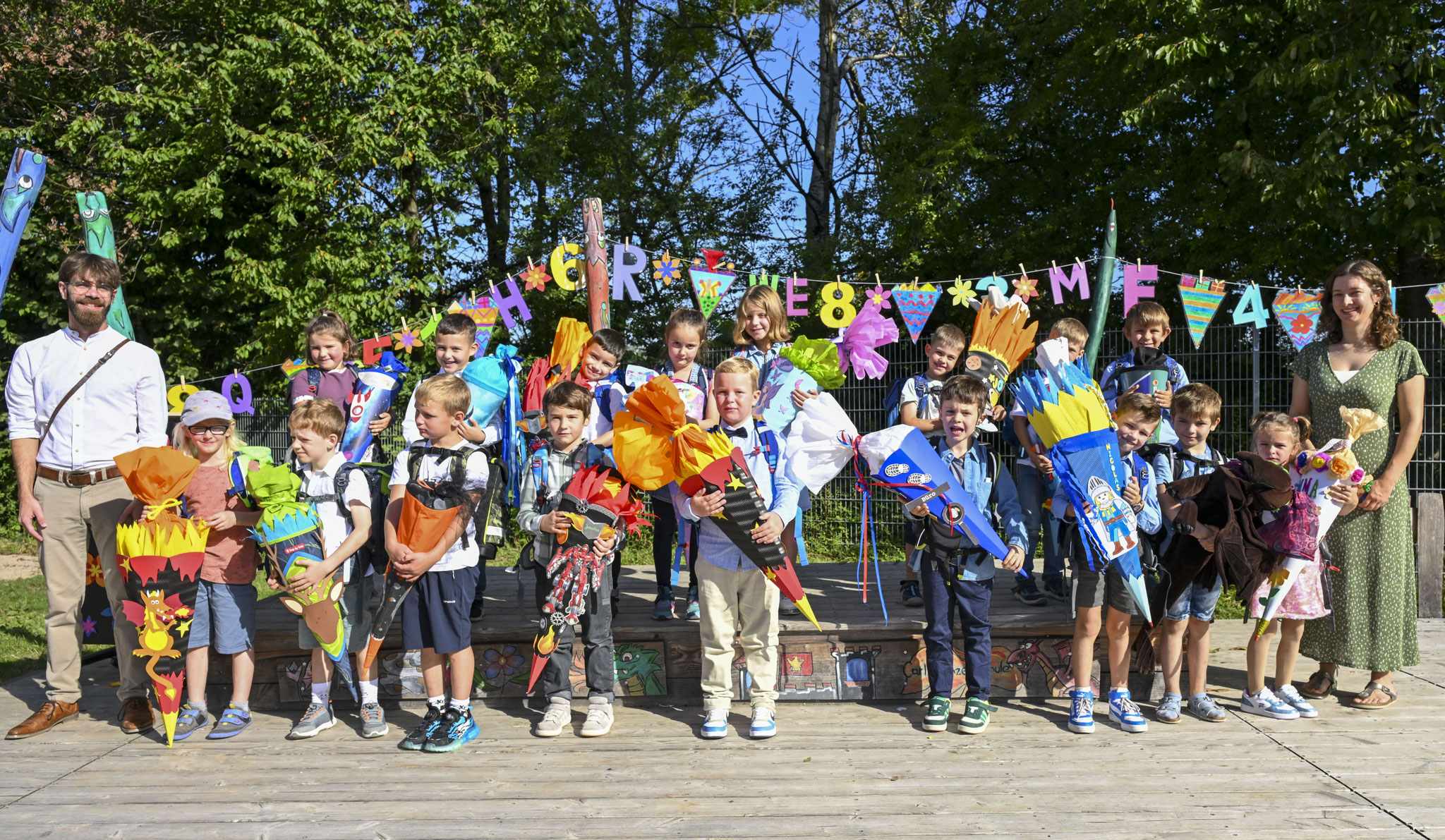 Nach einem donnernden Applaus für all die wunderbaren Beiträge wurden von Konrektor Gramm auch schon die Namen der Erstklässler verlesen, die dann sogleich von ihrer neuen Klassenlehrerin Frau Wagner (1a) und ihrem neuen Klassenlehrer Herr Huber (1b) in Empfang genommen wurden. Doch auch zwei Schulanfängerinnen aus der VKL 1 durften nicht fehlen und wurden von ihrem neuen Klassenlehrer Herr Silva herzlich begrüßt. Nachdem sich die Schulanfänger ein letztes Mal mitsamt Schultüte und Schulranzen dem Publikum präsentiert hatten und die letzten Fotos geschossen worden waren, hieß es dann endlich: Auf in die Klassenzimmer zur heiß ersehnten ersten Schulstunde! Währenddessen konnten sich alle Gäste bei kühlen Getränken und weiteren kleinen Stärkungen, angeboten durch den Elternbeirat, stärken.