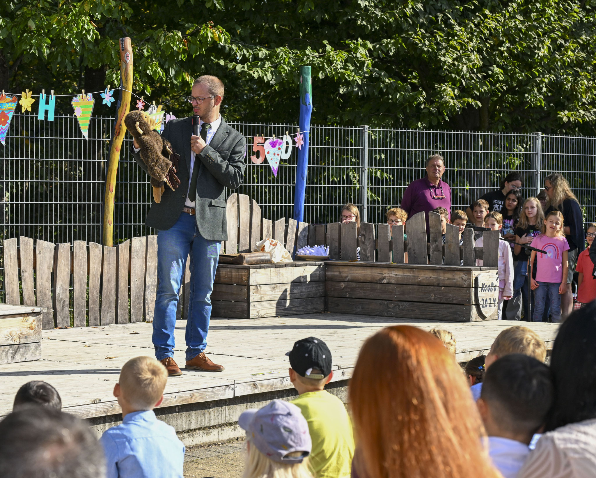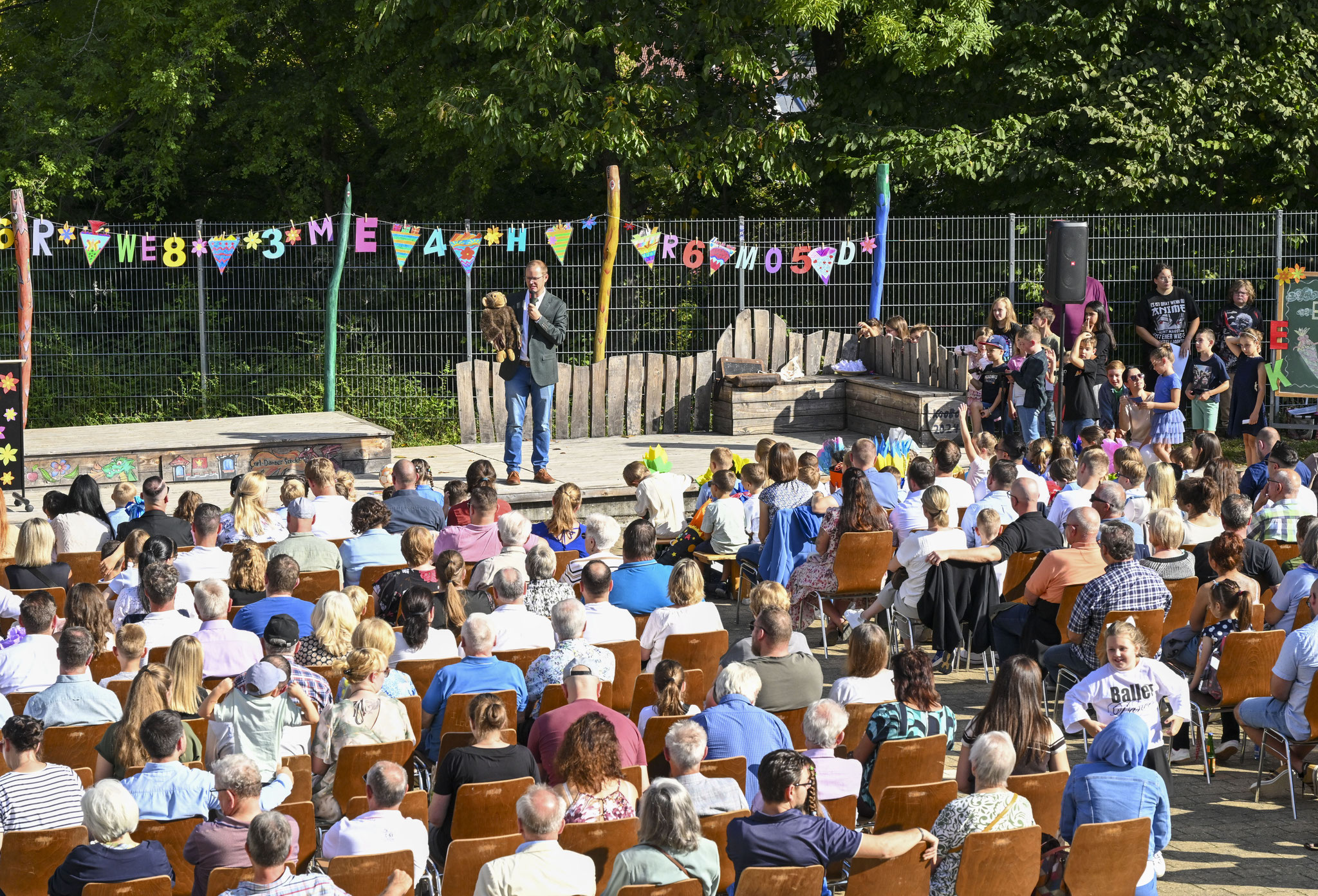 Am Samstag, den 20. September 2025, war die liebevoll geschmückte Open-Air-Bühne auf dem unteren Schulhof der Carl-Dänzer-Schule Odenheim DER Dreh- und Angelpunkt des Vormittags – und das bei tollstem Spätsommerwetter. Dort herrschte nämlich bereits um 9.30 Uhr reges Treiben und der Schulhof füllt sich anlässlich der Einschulungsfeier der neuen Erstklässler zum Schuljahr 2025/26 zusehends mit freudig aufgeregten großen und kleinen Menschen.