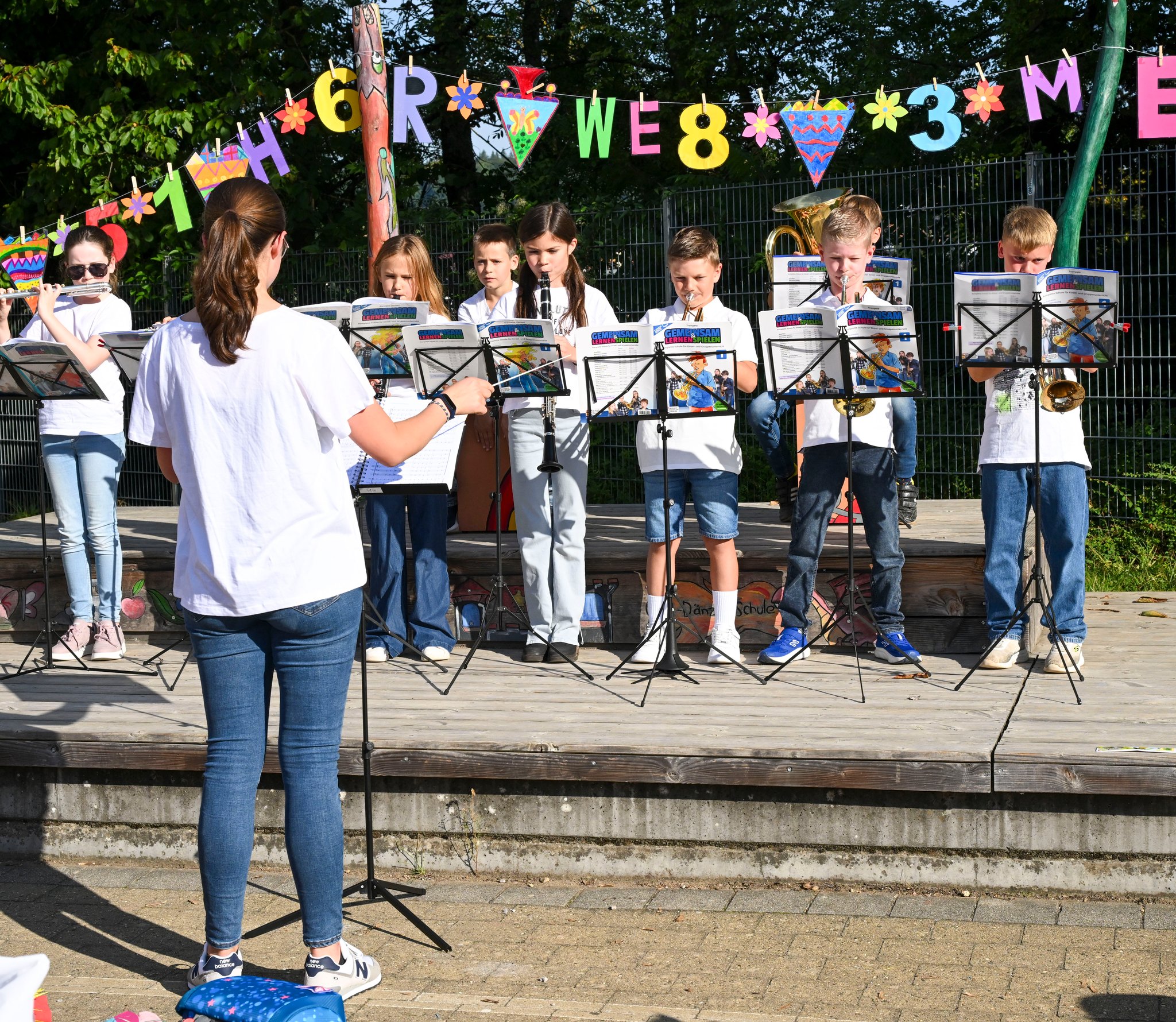 Punkt 10 Uhr war es dann endlich soweit: Die Grundschüler der Bläserklasse eröffneten unter der Leitung unserer ehemaligen Schülerin Jessica Breuner mit einem schmissigen musikalischen Beitrag